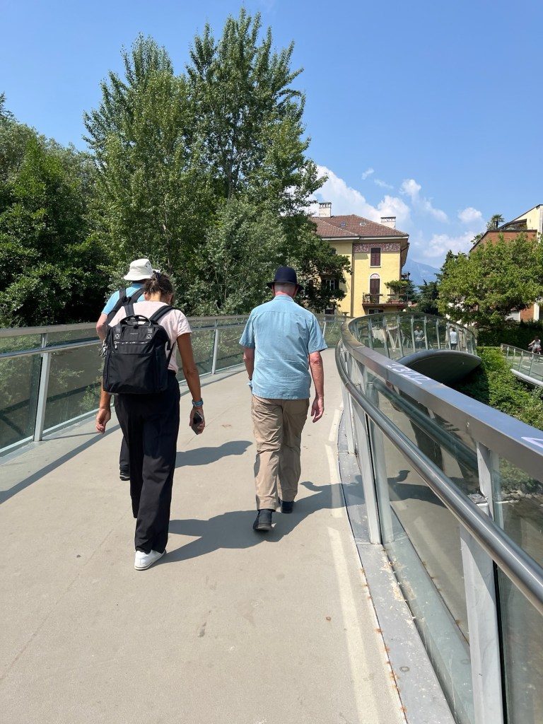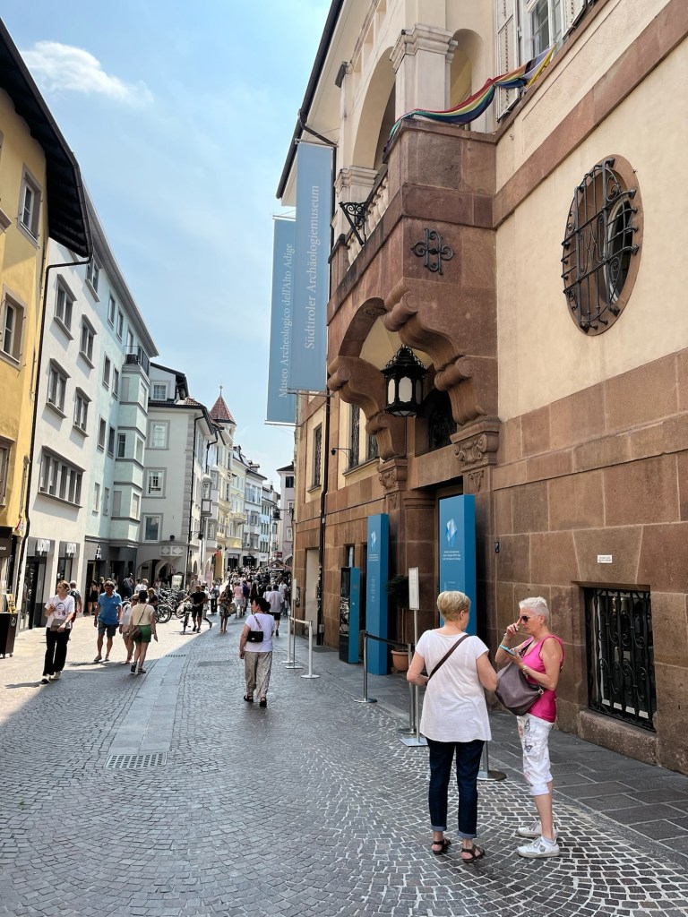 We try to travel south into the heart of Bolzano without much trouble, but are challenged to find a parking space near where we think the Archeological Museum is. We ask a man on the street who points around a corner and we use up a smidge of our travel luck and pull into a small parking lot where a car is just leaving. We use up a little more of our travel luck when another couple explain how to use the parking payment machine after our first 8 or 9 attempts. All good. Stroll along a path lined with plum trees … joggers, dog walkers, and a few streets later we’re at the museum.