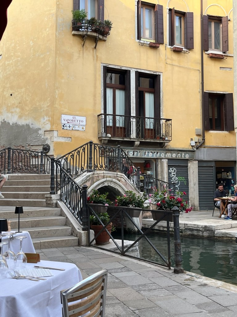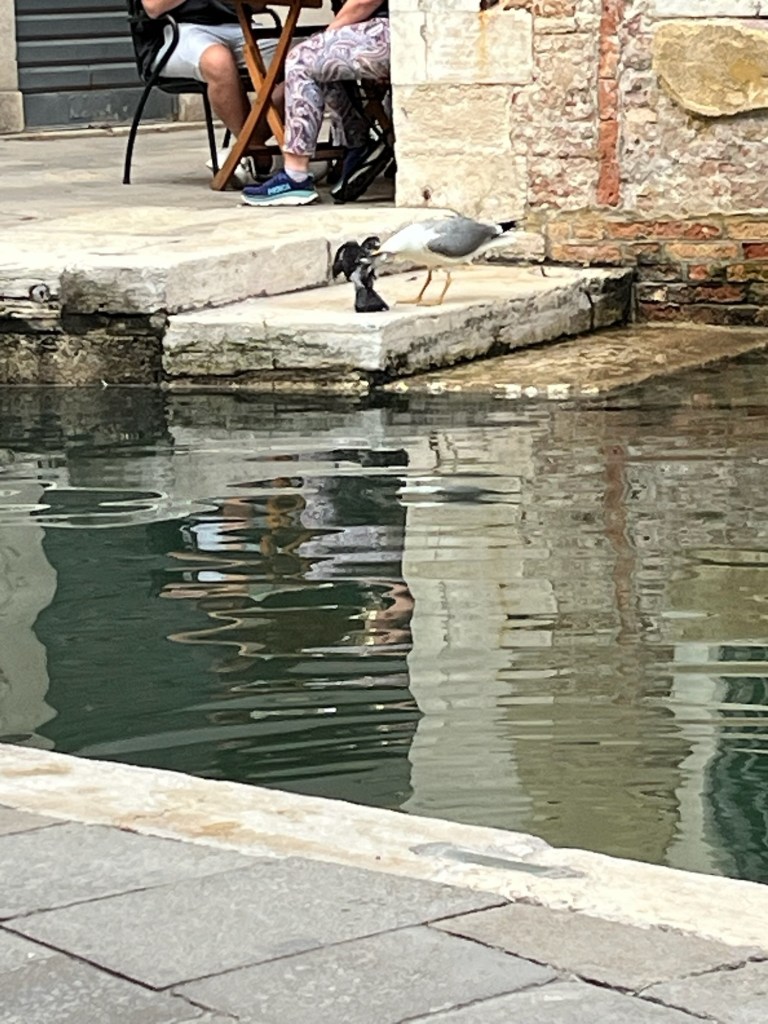 We are charmed by it all. We find a canal-side spot for dinner — gondolas waft by on a thin canal and a seagull attacks and devours a pigeon right in front of us, and a sparse stream of international tourists, singly, in pairs, in families, in groups pass by — and life is good.