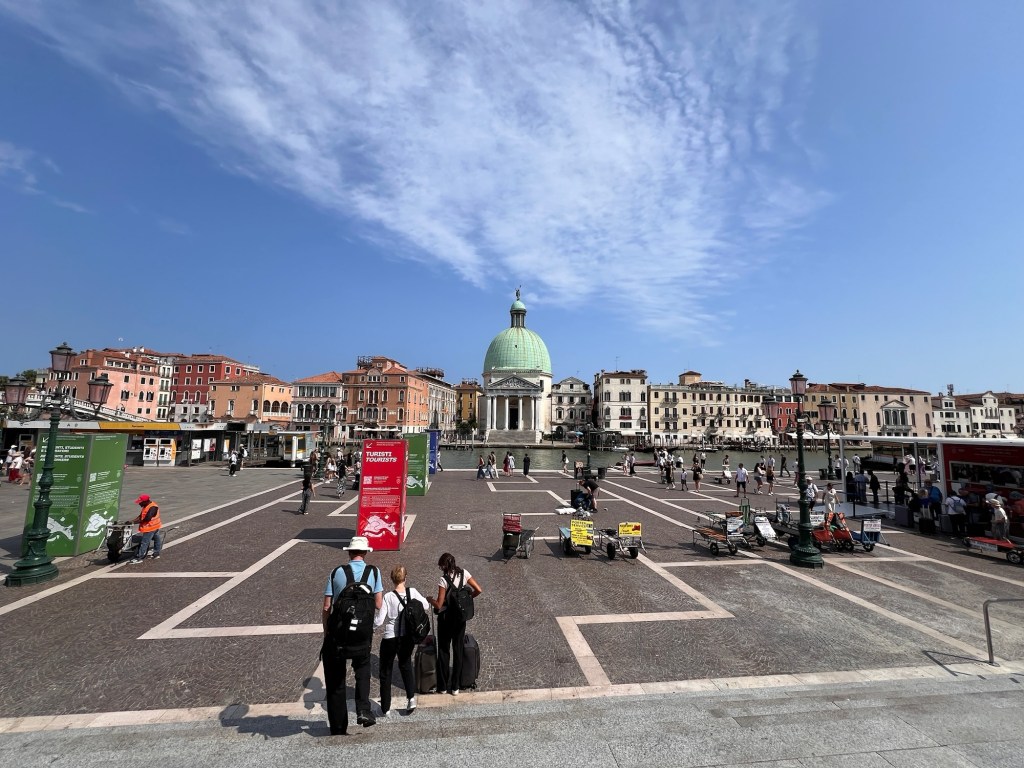 We deposit the car, train to Venezia S.L., stop for strawberry gelato crowned with a chocolate disk, and exit the station, hunting for the 7-day vaporetto pass ticket counter.