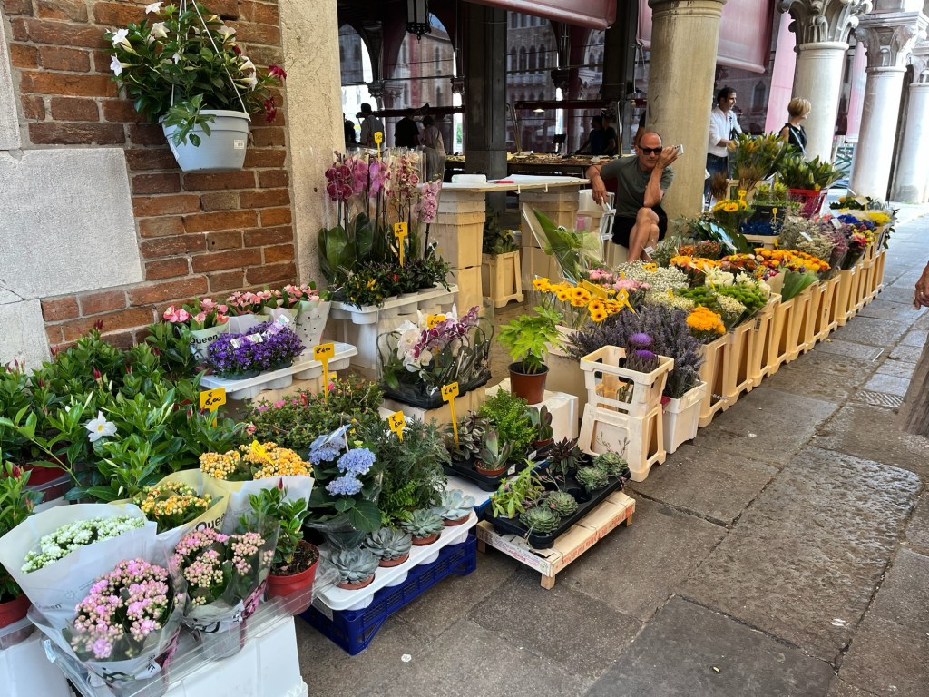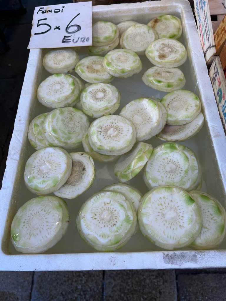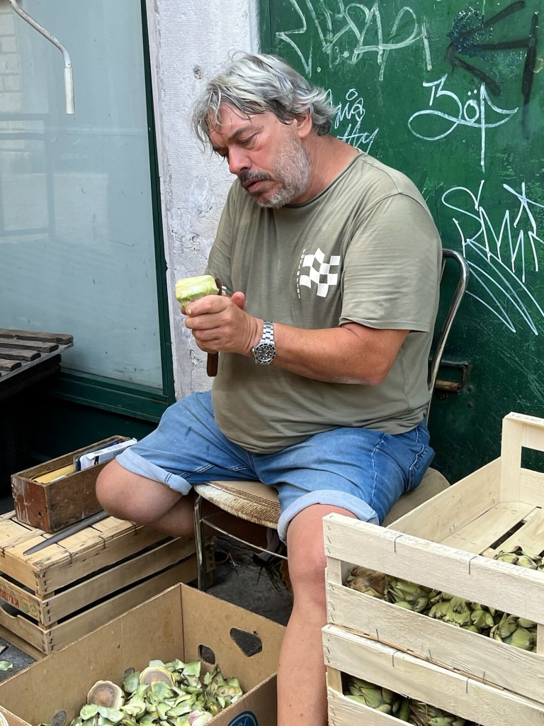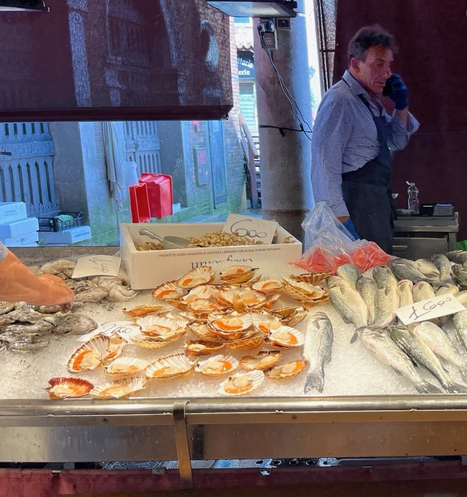 And, the market. Not the grandest I have seen but still interesting. A market with gondolas nearby, artichokes peeled to a slice of heart, and scallops with the roe intact.