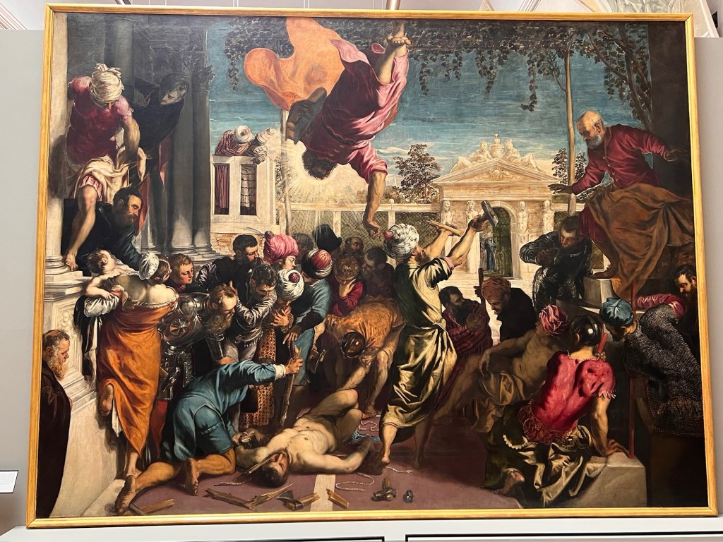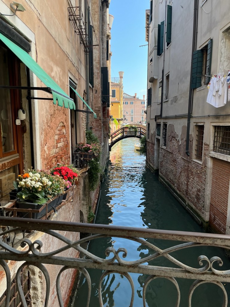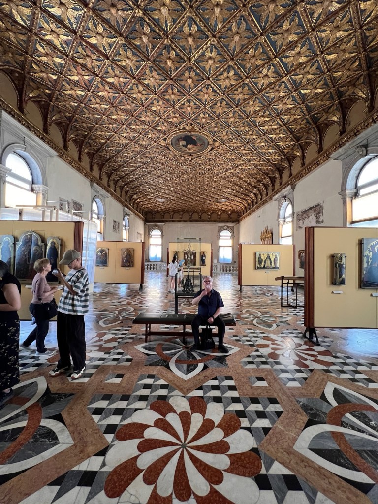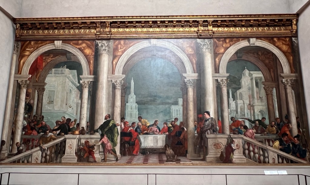 The four of us reconnect at Gallerie dell’Accademia, right on its own vapo stop on the Grand Canal. Aperol spritz under umbrellas in the cafe outside while waiting for our timed entry tickets, which it took us four tries to buy at breakfast.