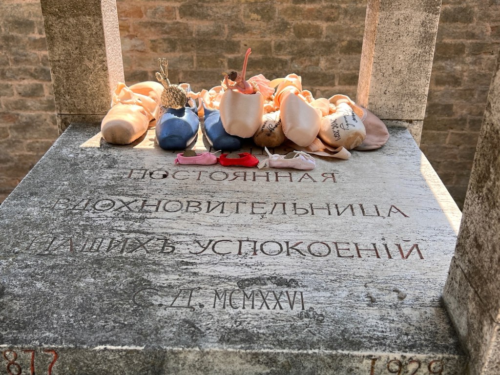 The cemetery: Sprawling, dozens of sections separated by trees and walls and chapels, but all fairly well marked. Despite the sign at the entrance that forbids photography, the few other tourists we see click with abandon. There’s Ezra Pound, Igor Stravinsky and his wife, Emma, and, unexpected by me, Sergei Diaghilev whose tomb is adorned with ballet slippers and a few coins of several nationalities. Here and there, wooden boxes on stands, like street libraries, house written remembrances from visitors.