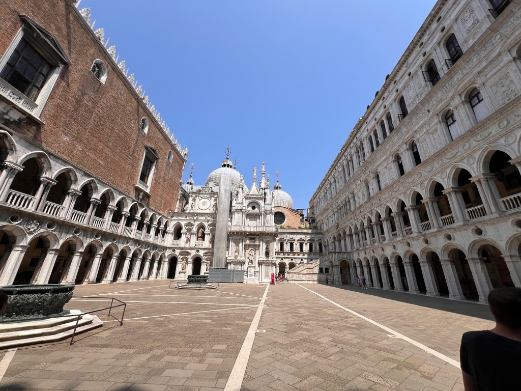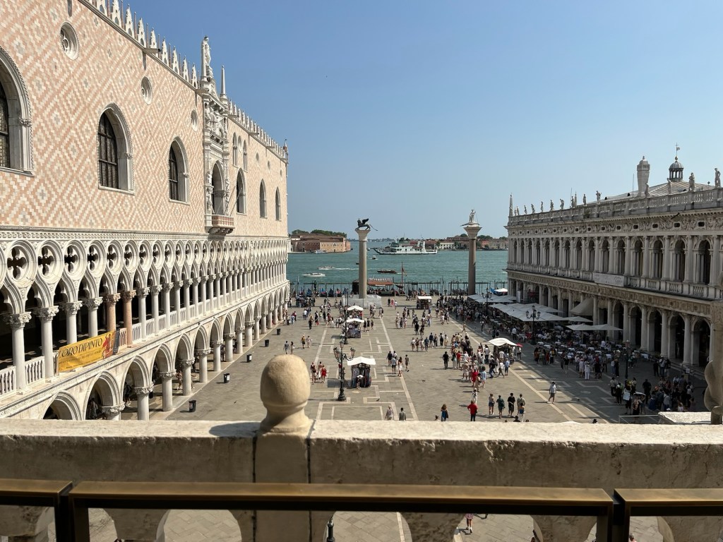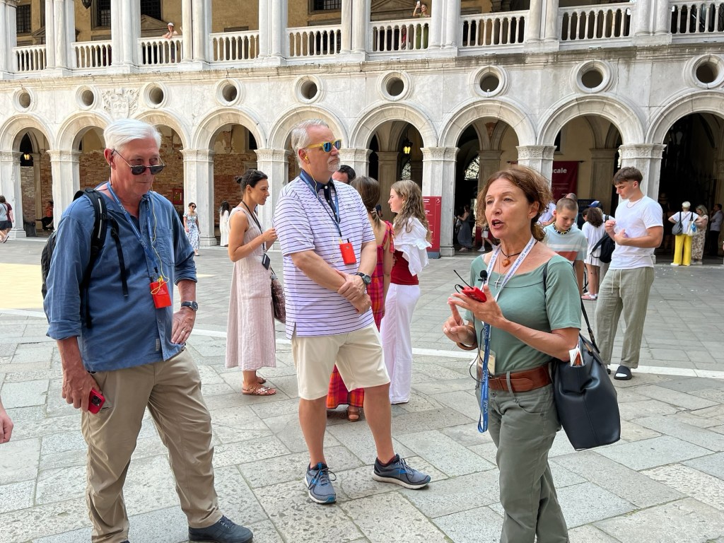 We’re back on a SLSG tour today, meeting our guide to the Doge’s Palace on St. Marks Square in the garden, where we seek shade from the 90 degree, 80 percent humidity.