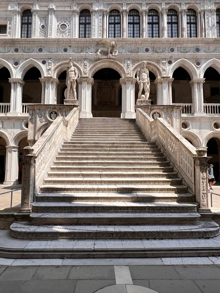 We do get into the palace readily and the inner court is surprisingly empty: the long colonnades on the left and right squared off by the dome of St. Marks basilica at the left end (unfortunately with some renovation in the middle of its facade) and the Giants staircase at the right end, topped by Sansovino’s huge statues of Mars and Neptune, representing Venice’s dominance on land and sea.