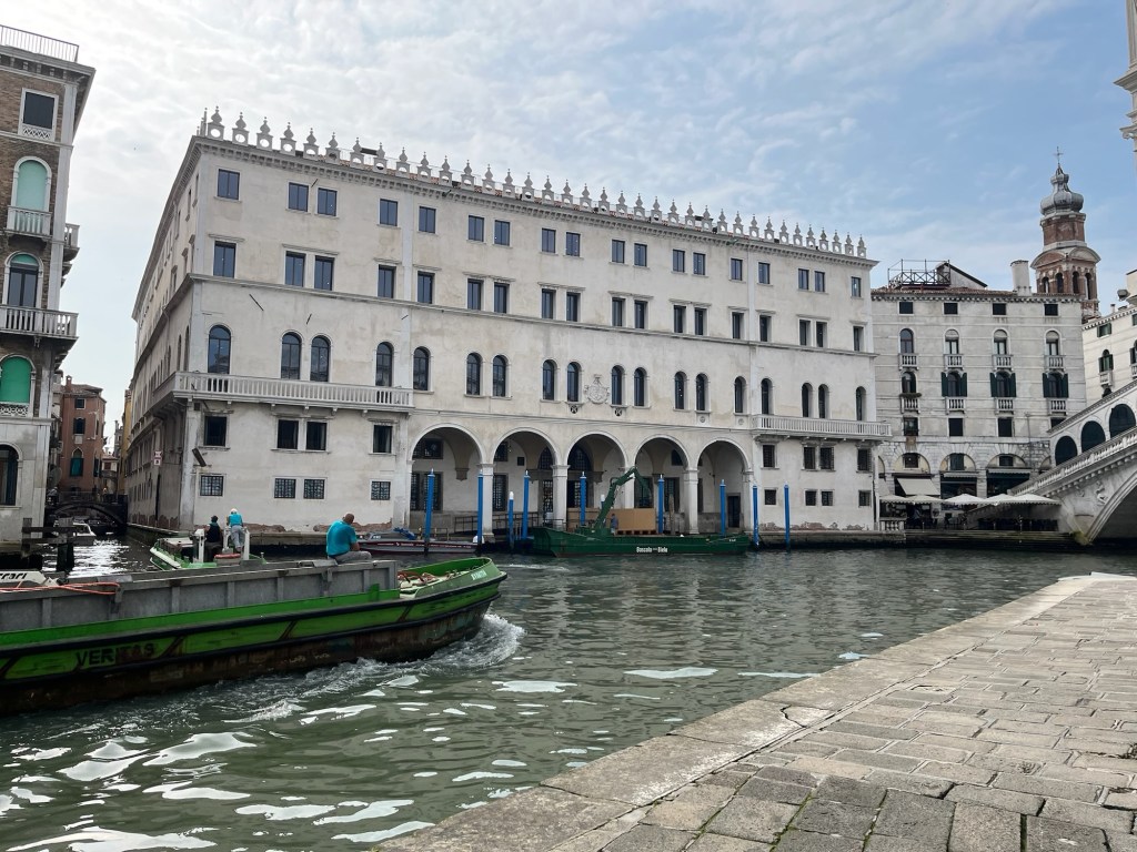 We meet Michael at the top of the center stairway of the Rialto Bridge for our second “city” tour: “A City of Nations” will focus on the the ways that different immigrant groups over time have changed Venice and been been changed by it. First up: The German Exchange building, a very large warehouse-cum-hotel originally built in 1228 (rebuilt after a fire in 1505). The European traders were required to stay there and give up their weapons. But, being basically HRE Christians, they were treated marginally better than the Ottoman Turks, who were required to live in their own Exchange. Again, the Venetians TRUSTED NOBODY, basically isolating foreigners and taxing their goods.